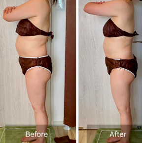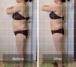 これらが筋膜リリースによって施術後は別人の様に姿勢が良くなり、滞っていたむくみや脂肪が退いています。